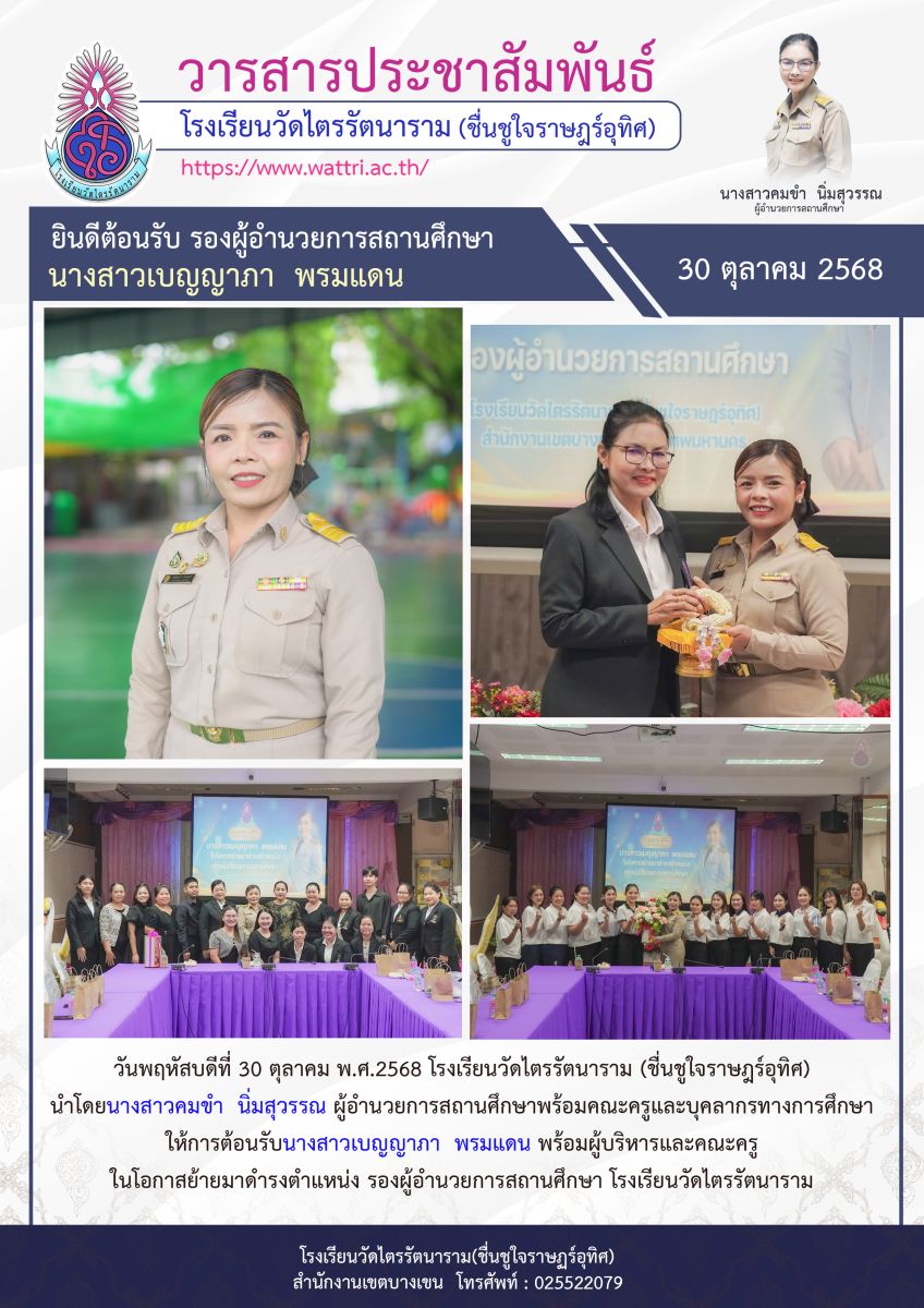 วันพฤหัสบดีที่ 30 ตุลาคม พ.ศ.2568 โรงเรียนวัดไตรรัตนาราม (ชื่นชูใจราษฎร์อุทิศ) นำโดยนางสาวคมขำ นิ่มสุวรรณ ผู้อำนวยการสถานศึกษาพร้อมคณะครูและบุคลากรทางการศึกษา ให้การต้อนรับนางสาวเบญญาภา พรมแดน พร้อมผู้บริหารและคณะครู ในโอกาสย้ายมาดำรงตำแหน่ง รองผู้อำนวยการสถานศึกษา โรงเรียนวัดไตรรัตนาราม