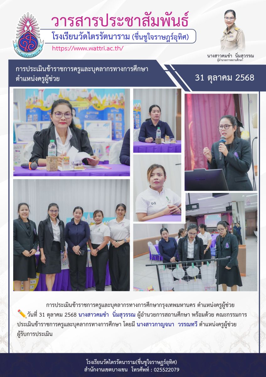 การประเมินข้าราชการครูและบุคลากรทางการศึกษากรุงเทพมหานคร ตำแหน่งครูผู้ช่วย ✏️วันที่ 31 ตุลาคม 2568 นางสาวคมขำ นิ่มสุวรรณ ผู้อำนวยการสถานศึกษา พร้อมด้วย คณะกรรมการประเมินข้าราชการครูและบุคลากรทางการศึกษา โดยมี นางสาวกาญจนา วรรณทวี ตำแหน่งครูผู้ช่วย ผู้รับการประเมิน