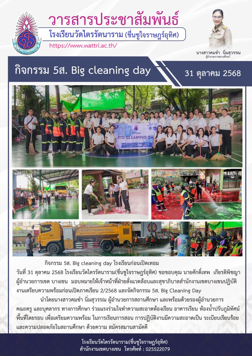 กิจกรรม 5ส. Big cleaning day โรงเรียนก่อนเปิดเทอม วันที่ 31 ตุลาคม 2568 โรงเรียนวัดไตรรัตนาราม(ชื่นชูใจราษฎร์อุทิศ) ขอขอบคุณ นายศักดิ์เทพ เกียรติพิชญา ผู้อำนวยการเขต บางเขน มอบหมายให้เจ้าหน้าที่ฝ่ายรักษาความสะอาดและสวนสาธารณะ สำนักงานเขตบางเขนปฏิบัติงานเตรียบความพร้อมก่อนเปิดภาคเรียน 2/2568 และจัดกิจกรรม 5ส. Big Cleaning Day