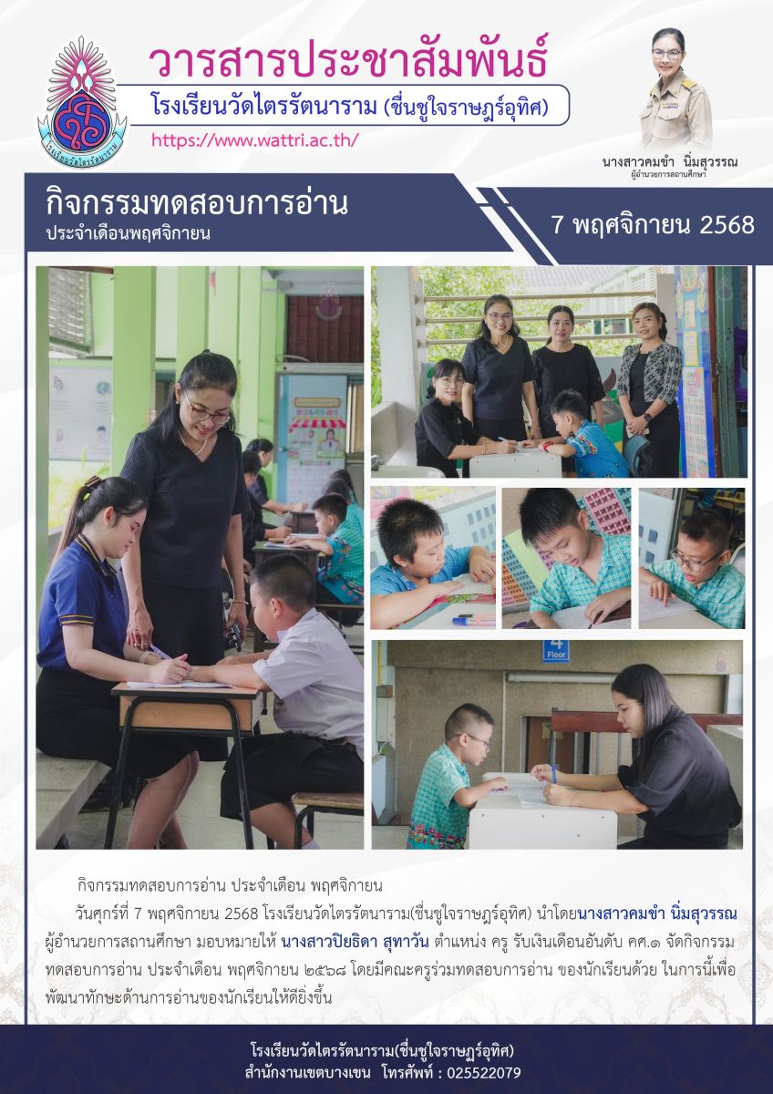 วันศุกร์ที่ 7 พฤศจิกายน 2568 โรงเรียนวัดไตรรัตนาราม(ชื่นชูใจราษฎร์อุทิศ) นำโดยนางสาวคมขำ นิ่มสุวรรณ ผู้อำนวยการสถานศึกษา มอบหมายให้ นางสาวปิยธิดา สุทาวัน ตำแหน่ง ครู รับเงินเดือนอันดับ คศ.๑ จัดกิจกรรม ทดสอบการอ่าน ประจำเดือน พฤศจิกายน ๒๕๖๘ โดยมีคณะครูร่วมทดสอบการอ่าน ของนักเรียนด้วย ในการนี้เพื่อพัฒนาทักษะด้านการอ่านของนักเรียนให้ดียิ่งขึ้น