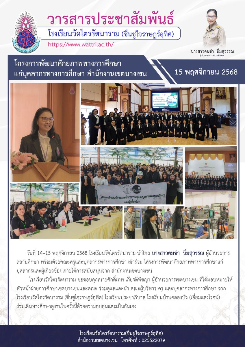 วันที่ 14–15 พฤศจิกายน 2568 โรงเรียนวัดไตรรัตนาราม นำโดย นางสาวคมขำ นิ่มสุวรรณ ผู้อำนวยการสถานศึกษา พร้อมด้วยคณะครูและบุคลากรทางการศึกษา เข้าร่วม โครงการพัฒนาศักยภาพทางการศึกษาแก่บุคลากรและผู้เกี่ยวข้อง ภายใต้การสนับสนุนจาก สำนักงานเขตบางเขน โรงเรียนวัดไตรรัตนาราม ขอขอบคุณนายศักดิ์เทพ เกียรติพิชญา ผู้อำนวยการเขตบางเขน ที่ได้มอบหมายให้หัวหน้าฝ่ายการศึกษาเขตบางเขนและคณะ ร่วมดูแลและนำ คณะผู้บริหาร ครู และบุคลากรทางการศึกษา จาก โรงเรียนวัดไตรรัตนาราม (ชื่นชูใจราษฎร์อุทิศ) โรงเรียนประชาภิบาล โรงเรียนบ้านคลองบัว (เอี่ยมแสงโรจน์) ร่วมเดินทางศึกษาดูงานในครั้งนี้ด้วยความอบอุ่นและเป็นกันเอง