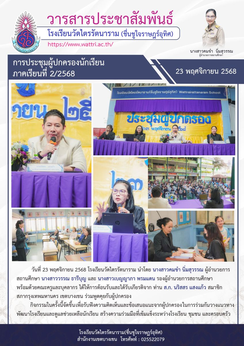 วันที่ 23 พฤศจิกายน 2568 โรงเรียนวัดไตรรัตนาราม นำโดย นางสาวคมขำ นิ่มสุวรรณ ผู้อำนวยการสถานศึกษา นางสาววรรณ ธารีบุญ และ นางสาวเบญญาภา พรมแดน รองผู้อำนวยการสถานศึกษา พร้อมด้วยคณะครูและบุคลากร ได้ให้การต้อนรับและได้รับเกียรติจาก ท่าน ส.ก. นริสสร แสงแก้ว สมาชิกสภากรุงเทพมหานคร เขตบางเขน ร่วมพูดคุยกับผู้ปกครอง