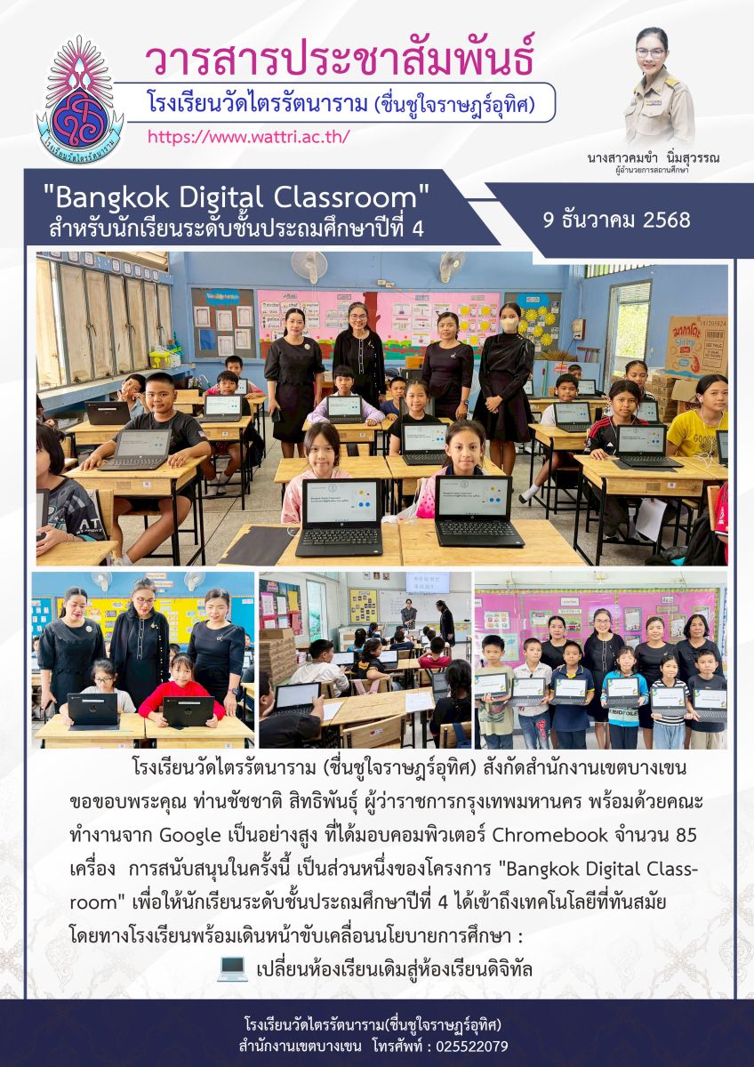โรงเรียนวัดไตรรัตนาราม (ชื่นชูใจราษฎร์อุทิศ) สังกัดสำนักงานเขตบางเขน ขอขอบพระคุณ ท่านชัชชาติ สิทธิพันธุ์ ผู้ว่าราชการกรุงเทพมหานคร พร้อมด้วยคณะทำงานจาก Google เป็นอย่างสูง ที่ได้มอบคอมพิวเตอร์ Chromebook จำนวน 85 เครื่อง การสนับสนุนในครั้งนี้ เป็นส่วนหนึ่งของโครงการ "Bangkok Digital Classroom" เพื่อให้นักเรียนระดับชั้นประถมศึกษาปีที่ 4 ได้เข้าถึงเทคโนโลยีที่ทันสมัย โดยทางโรงเรียนพร้อมเดินหน้าขับเคลื่อนนโยบายการศึกษา : เปลี่ยนห้องเรียนเดิมสู่ห้องเรียนดิจิทัล จัดการเรียนรู้ผ่าน Google Classroom ประยุกต์ใช้นวัตกรรม AI อย่าง "Gemini for Education" สิ่งเหล่านี้จะช่วยเปิดโลกแห่งการเรียนรู้ เพิ่มประสิทธิภาพการสอน และสร้างทักษะสำคัญในศตวรรษที่ 2