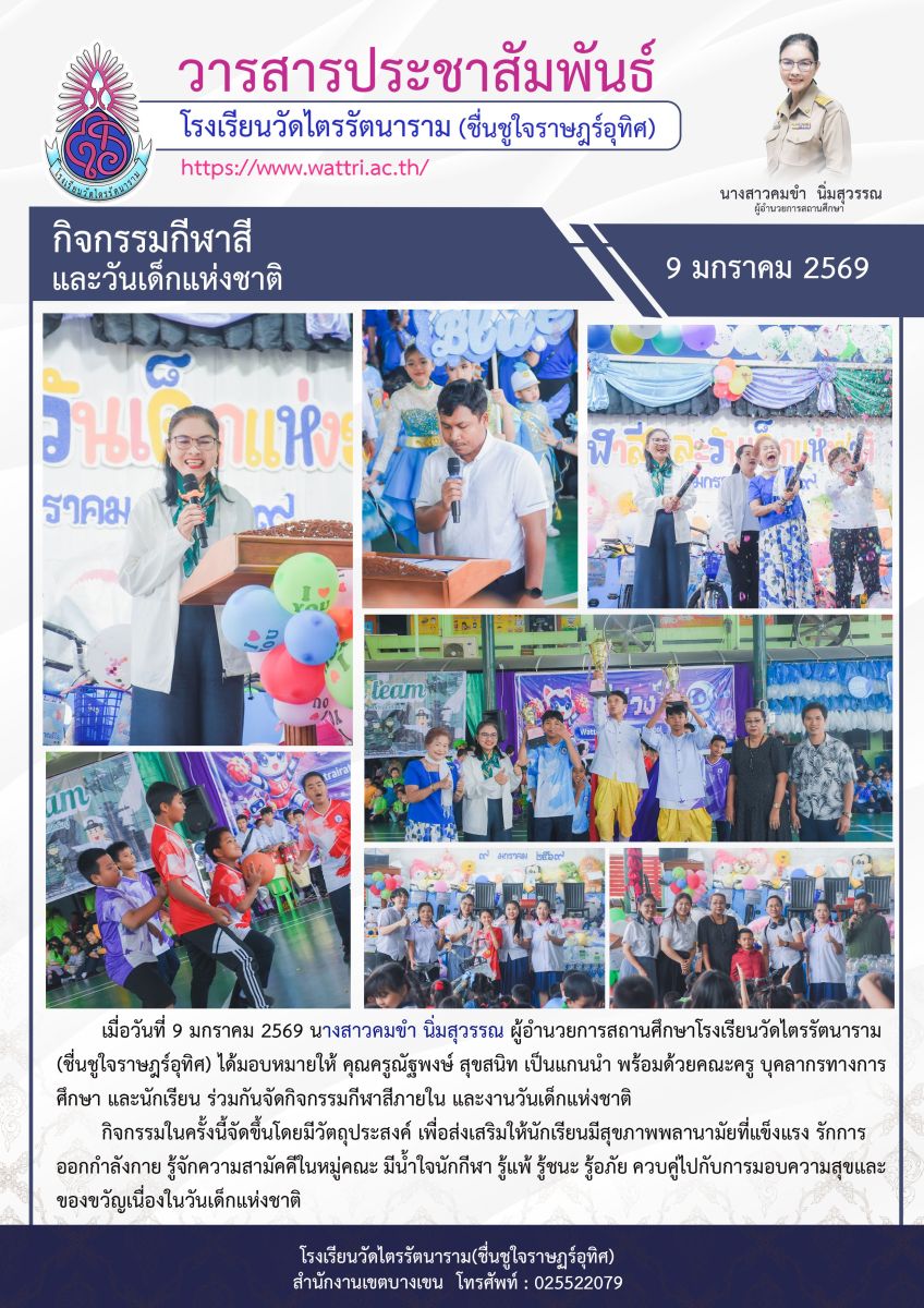 เมื่อวันที่ 9 มกราคม 2569 นางสาวคมขำ นิ่มสุวรรณ ผู้อำนวยการสถานศึกษาโรงเรียนวัดไตรรัตนาราม (ชื่นชูใจราษฎร์อุทิศ) ได้มอบหมายให้ คุณครูณัฐพงษ์ สุขสนิท เป็นแกนนำ พร้อมด้วยคณะครู บุคลากรทางการศึกษา และนักเรียน ร่วมกันจัดกิจกรรมกีฬาสีภายใน และงานวันเด็กแห่งชาติ