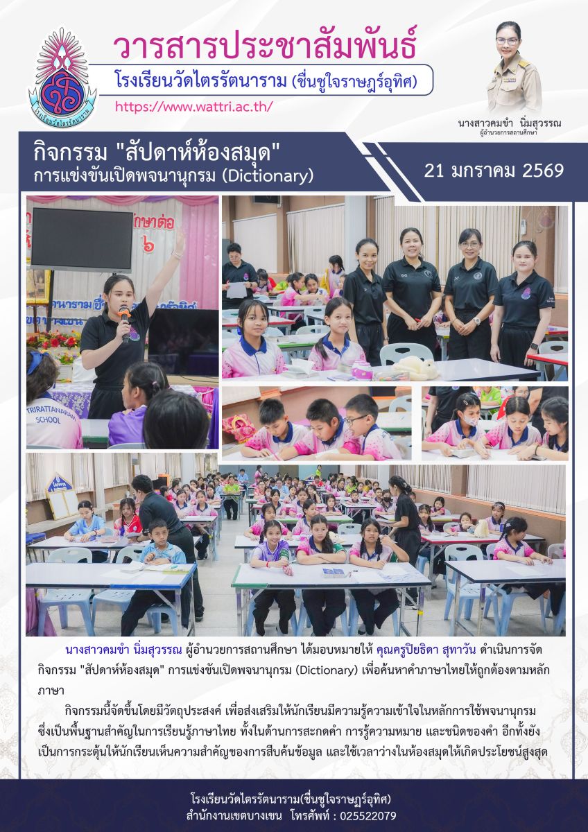 นางสาวคมขำ นิ่มสุวรรณ ผู้อำนวยการสถานศึกษา ได้มอบหมายให้ คุณครูปิยธิดา สุทาวัน ดำเนินการจัดกิจกรรม "สัปดาห์ห้องสมุด" การแข่งขันเปิดพจนานุกรม (Dictionary) เพื่อค้นหาคำภาษาไทยให้ถูกต้องตามหลักภาษา