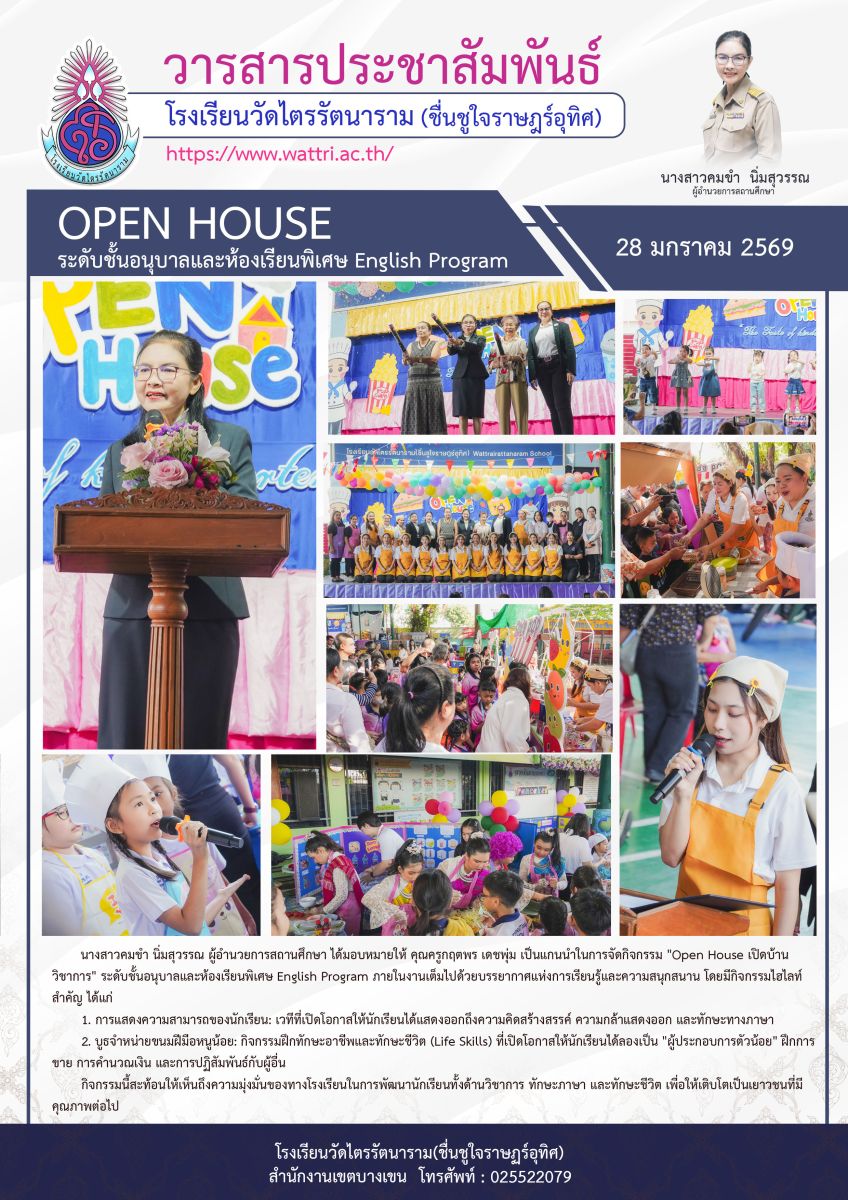 นางสาวคมขำ นิ่มสุวรรณ ผู้อำนวยการสถานศึกษา ได้มอบหมายให้ คุณครูกฤตพร เดชพุ่ม เป็นแกนนำในการจัดกิจกรรม "Open House เปิดบ้านวิชาการ" ระดับชั้นอนุบาลและห้องเรียนพิเศษ English Program ภายในงานเต็มไปด้วยบรรยากาศแห่งการเรียนรู้และความสนุกสนาน โดยมีกิจกรรมไฮไลท์สำคัญ ได้แก่