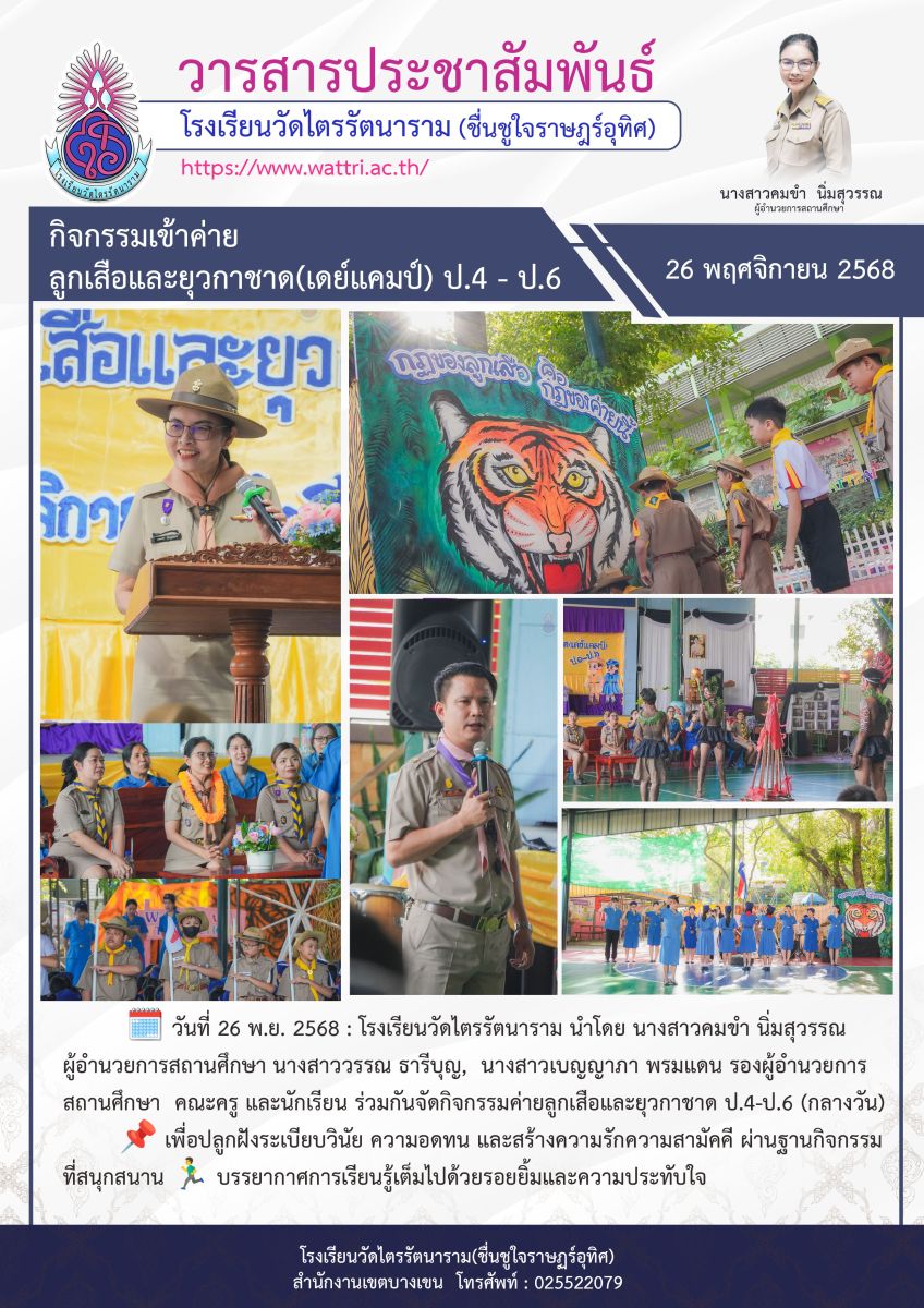 วันที่ 26 พ.ย. 2568 : โรงเรียนวัดไตรรัตนาราม นำโดย นางสาวคมขำ นิ่มสุวรรณ ผู้อำนวยการสถานศึกษา นางสาววรรณ ธารีบุญ, นางสาวเบญญาภา พรมแดน รองผู้อำนวยการสถานศึกษา คณะครู และนักเรียน ร่วมกันจัดกิจกรรมค่ายลูกเสือและยุวกาชาด ป.4-ป.6 (กลางวัน)