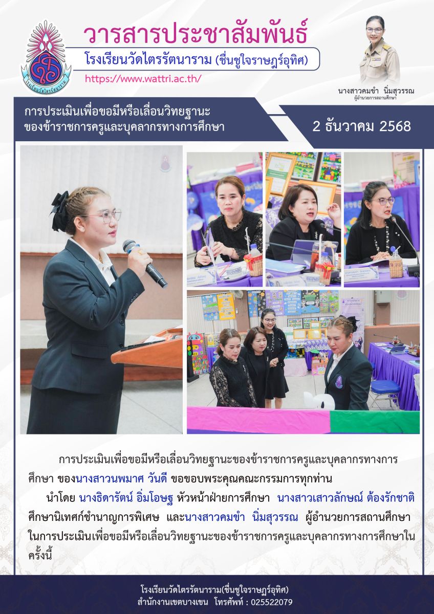 นำโดย นางธิดารัตน์ อิ่มโอษฐ หัวหน้าฝ่ายการศึกษา นางสาวเสาวลักษณ์ ต้องรักชาติ ศึกษานิเทศก์ชำนาญการพิเศษ และนางสาวคมขำ นิ่มสุวรรณ ผู้อำนวยการสถานศึกษา ในการประเมิน เพื่อขอมีหรือเลื่อนวิทยฐานะของข้าราชการครูและบุคลากรทางการศึกษาในครั้งนี้